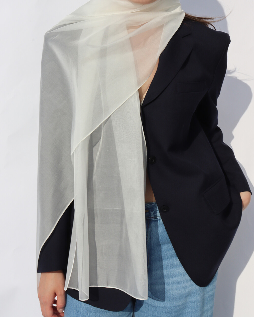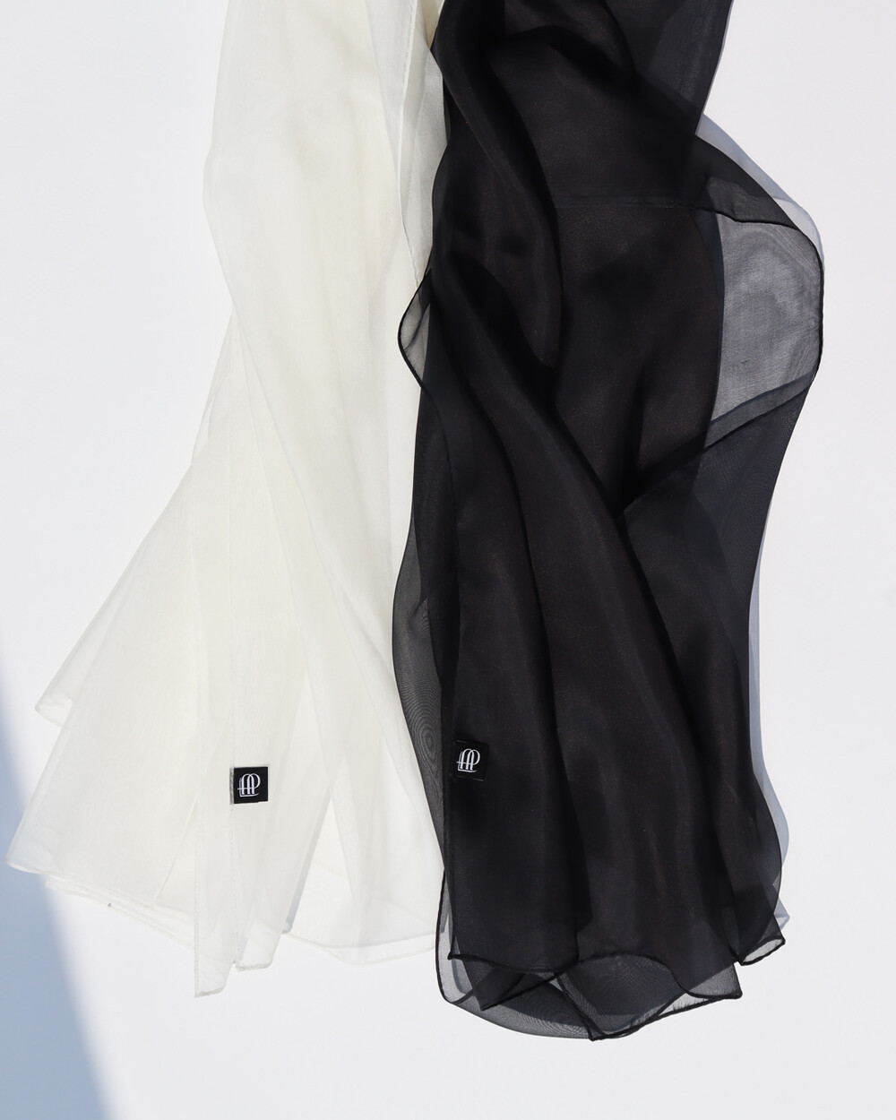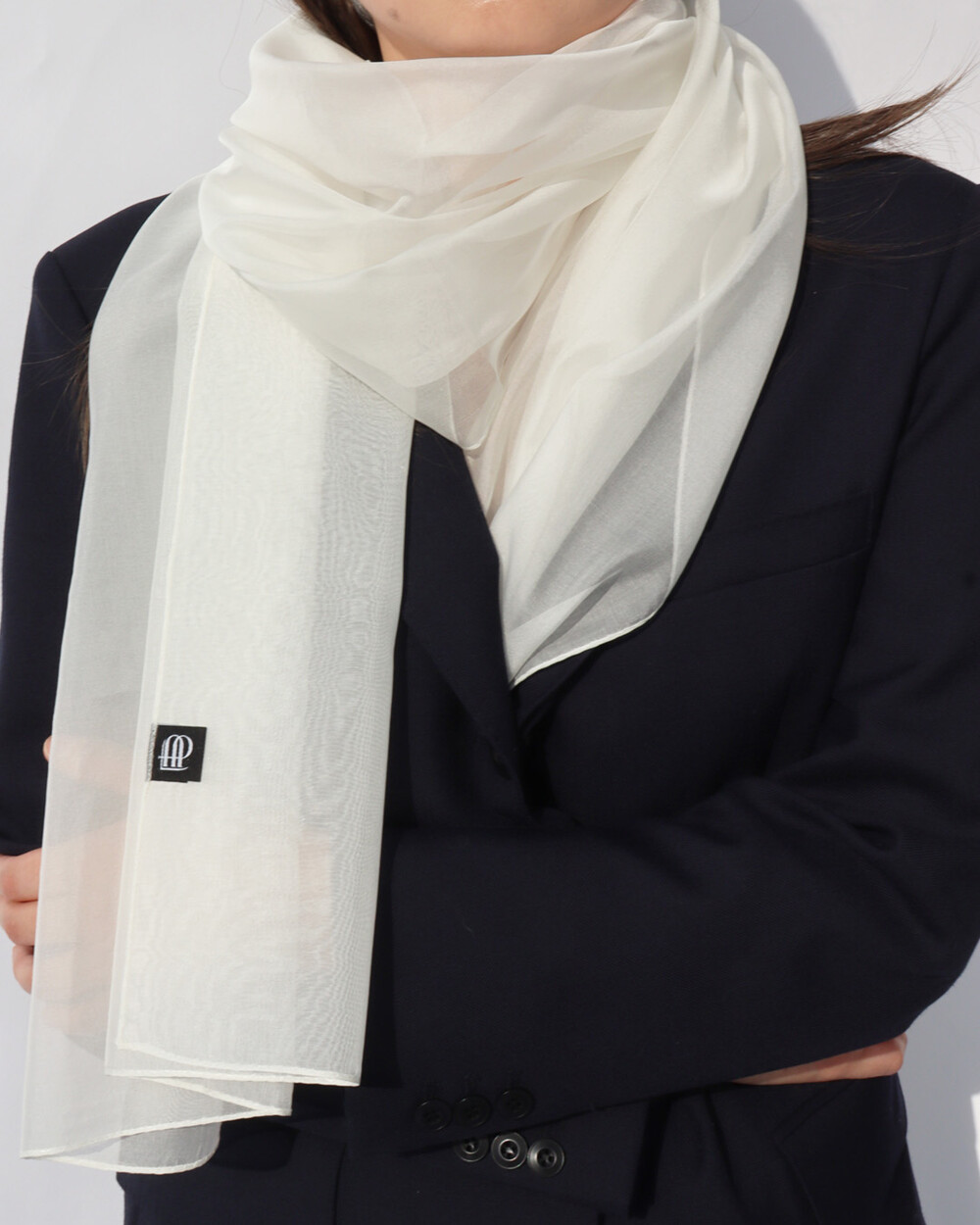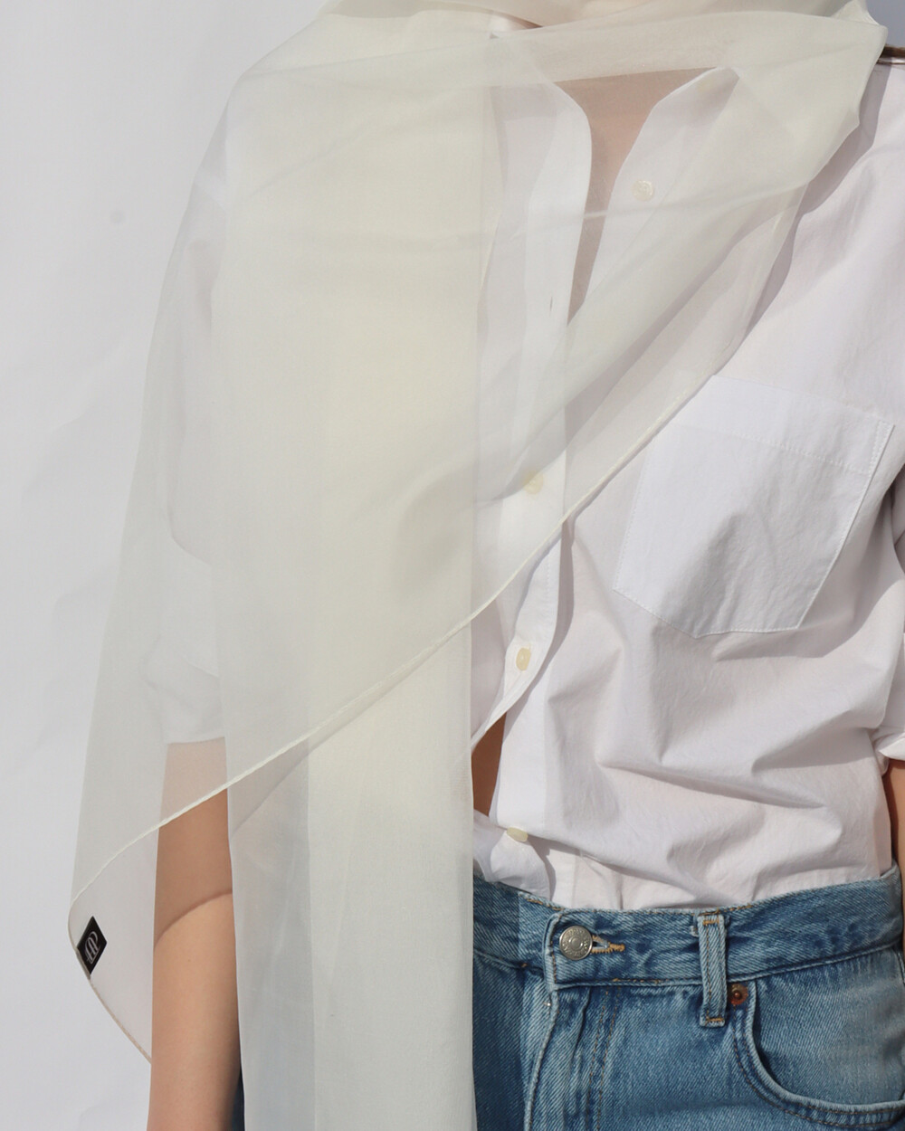 Architectural Volume: 오간디 특유의 힘 있는 텐션이 롱 기장과 만나, 가볍게 둘러도 구조적이고 입체적인 실루엣을 유지합니다.