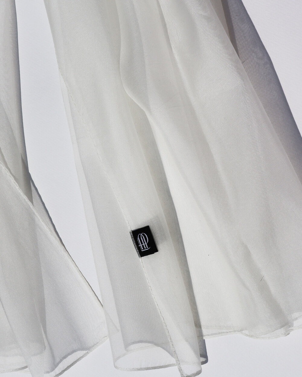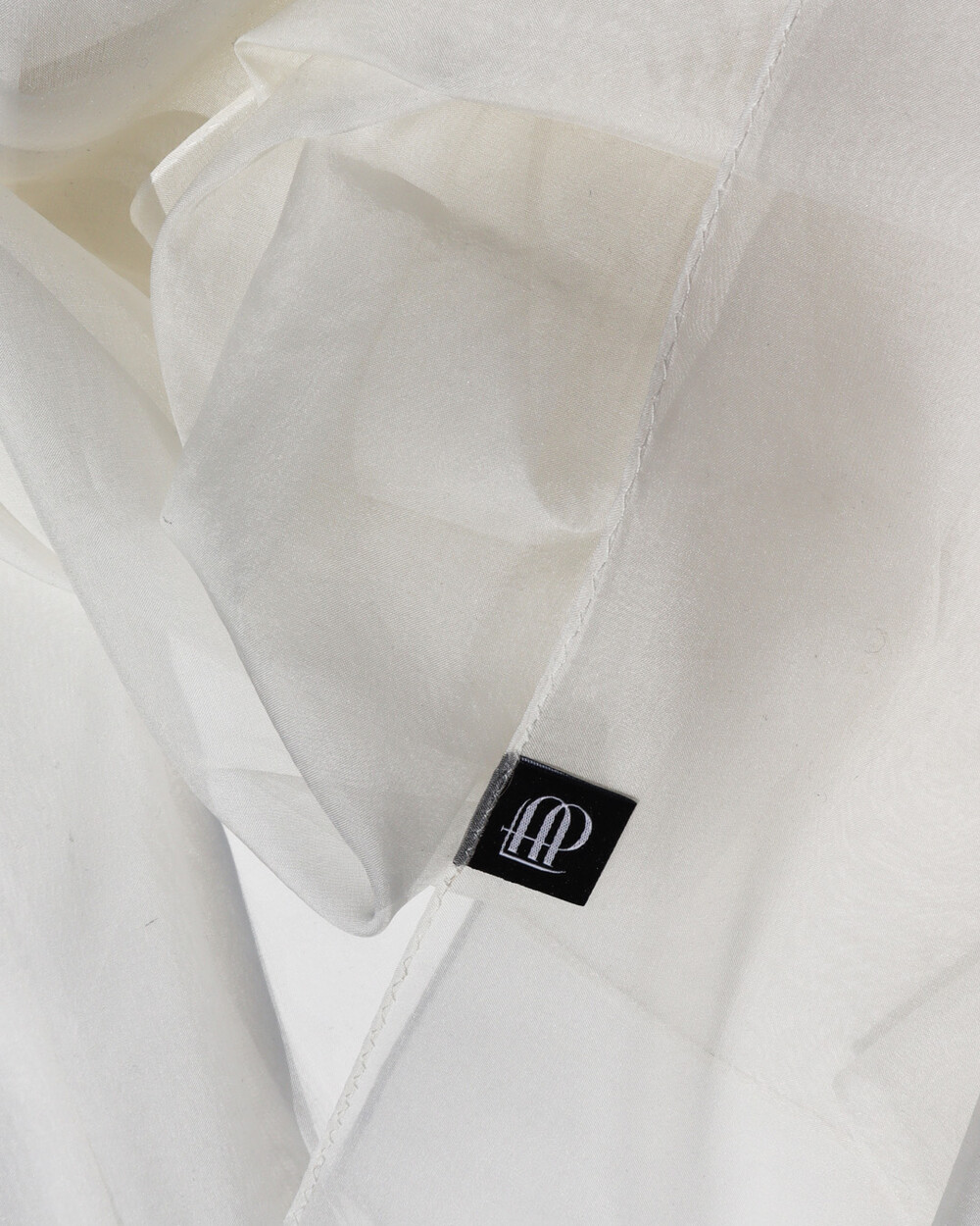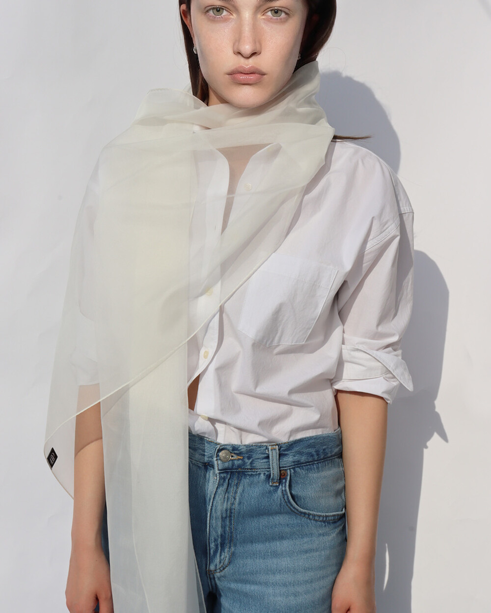 Architectural Volume: 오간디 특유의 힘 있는 텐션이 롱 기장과 만나, 가볍게 둘러도 구조적이고 입체적인 실루엣을 유지합니다.