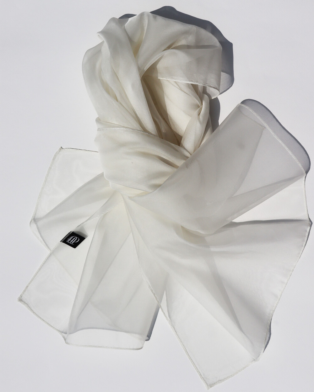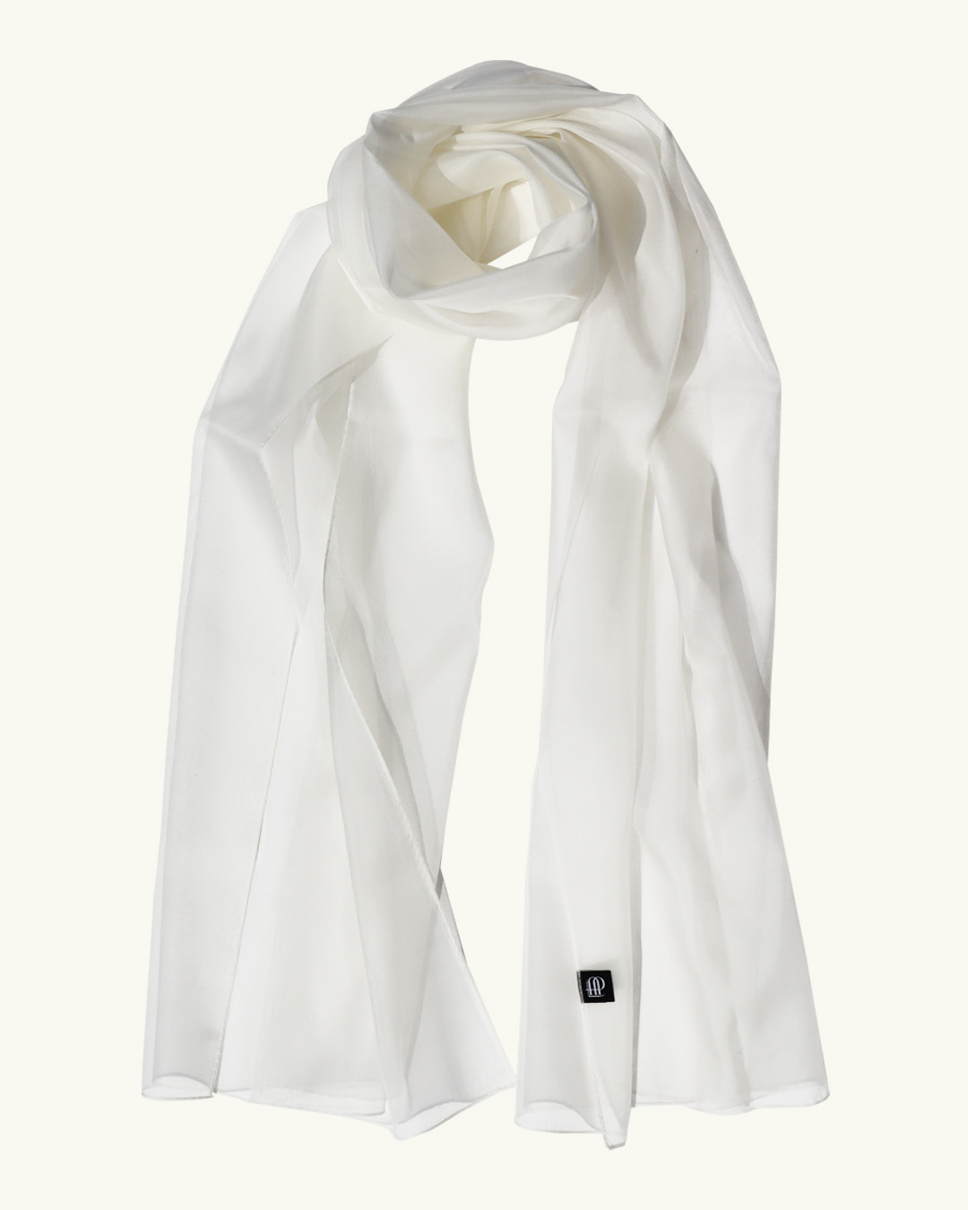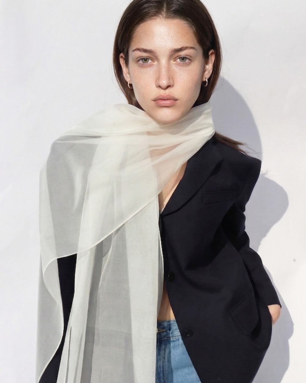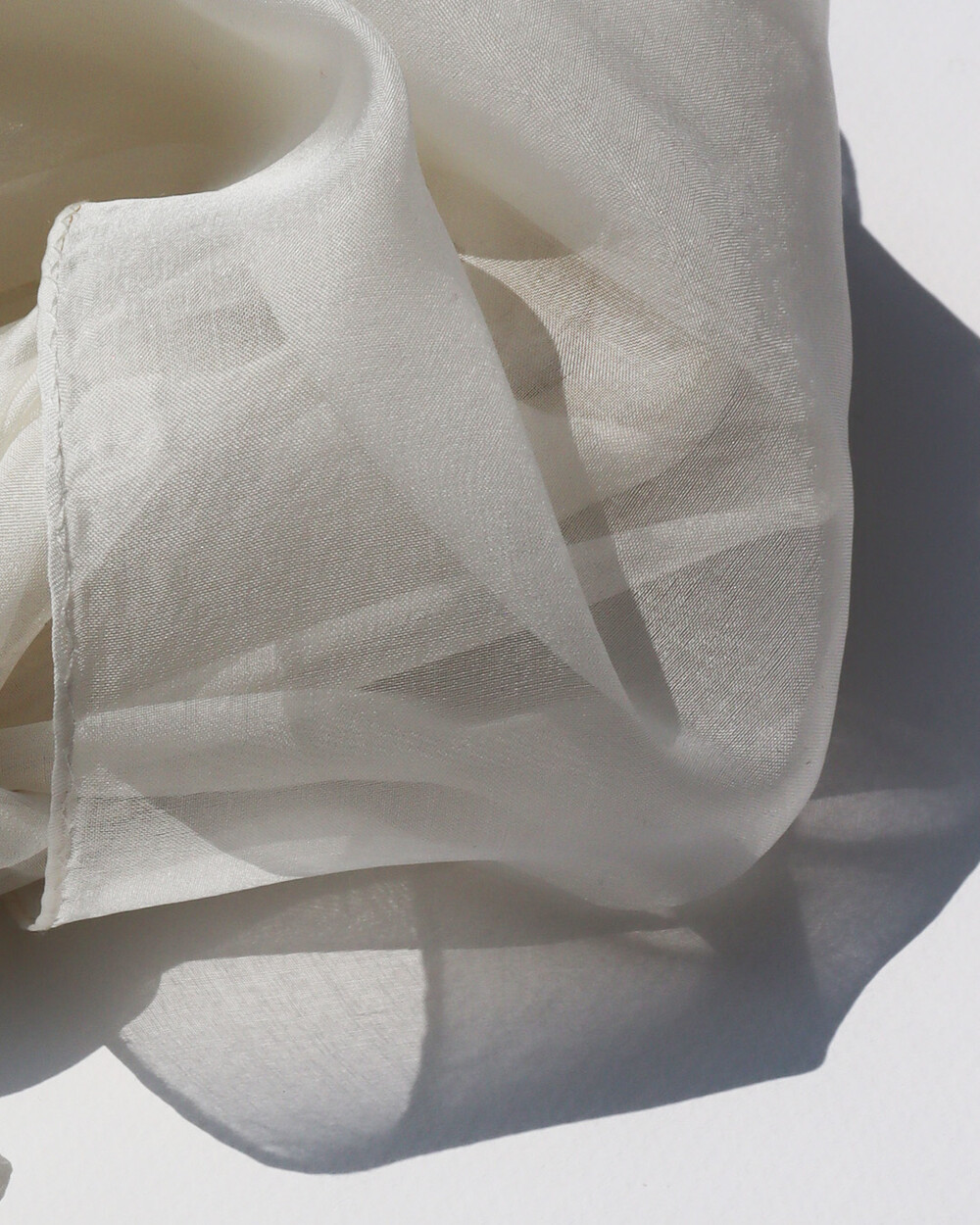Architectural Volume: 오간디 특유의 힘 있는 텐션이 롱 기장과 만나, 가볍게 둘러도 구조적이고 입체적인 실루엣을 유지합니다.